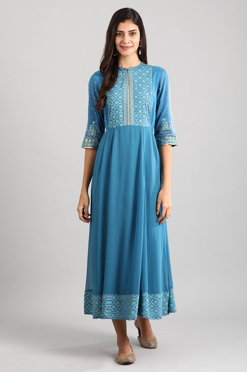 Blue band collar A-line Panelled Liva dress with printed Liva dress.