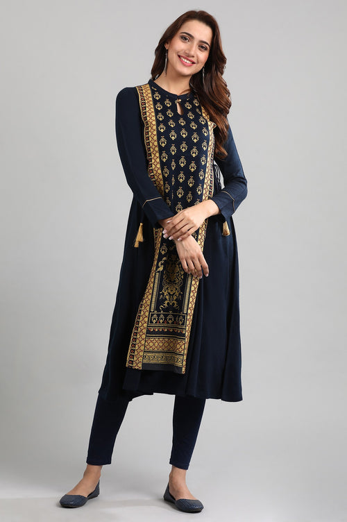 Blue band collar yarn-dyed winter kurta with tie-up detail on the front.
