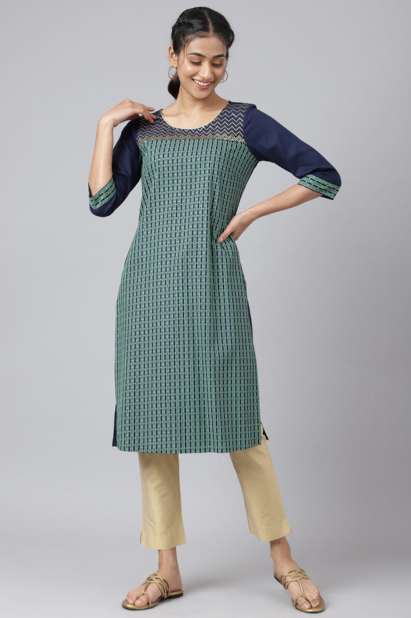 This is a color blocked kurta that features coloured stripes and golden foil printed polka dot pattern. The yoke has been highlighted with glitter sequin embroidery that follows a zig-zag fashion.