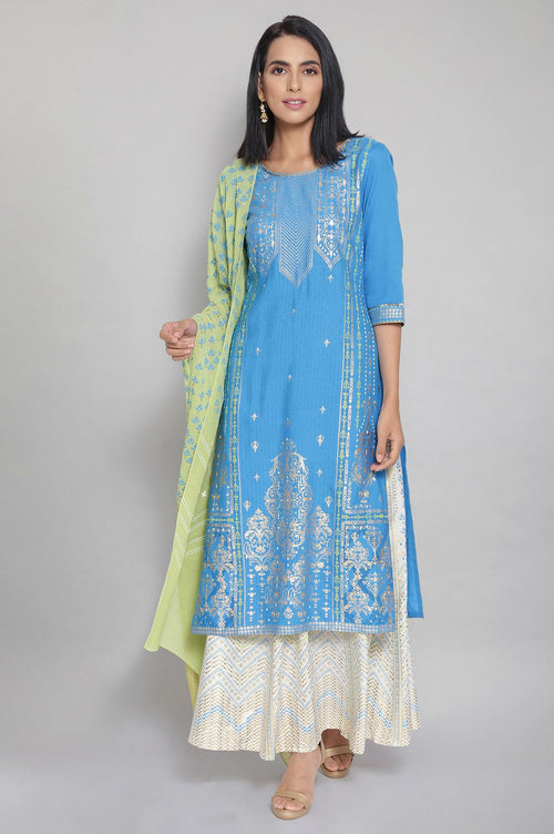 Step out in style and confidence in this pretty embellished ethnic set. The set includes blue kurta crafted in premium fabric. Flatters foil print and sequin detailing and coordinated with off-white printed skirt and green printed dupatta.