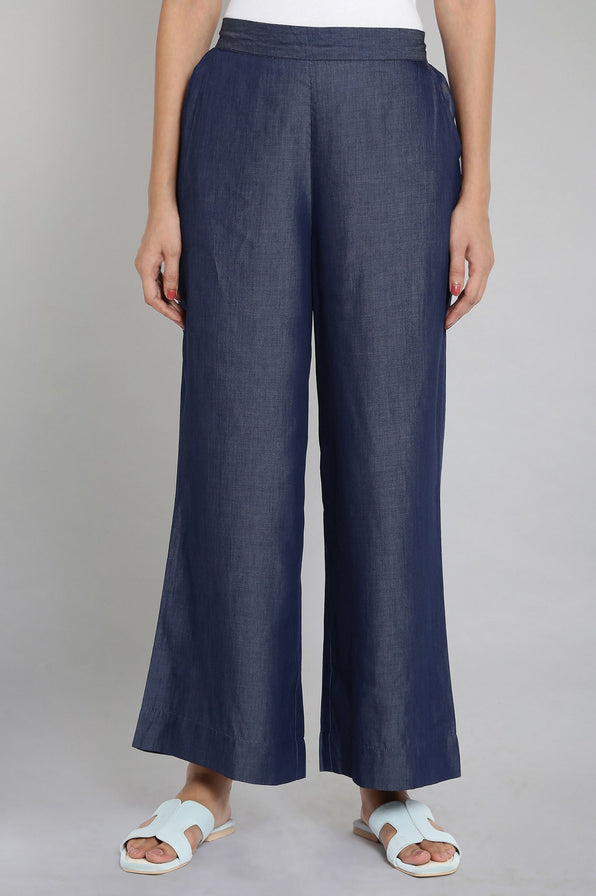 A solid blue palazzo in straight silhouette having mid-rise and partially elasticated waistband. The palazzo also has 2 front pocket and slip-on closure.