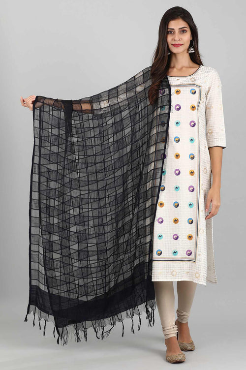 Blue yarn-dyed dupatta with fringes at both ends.