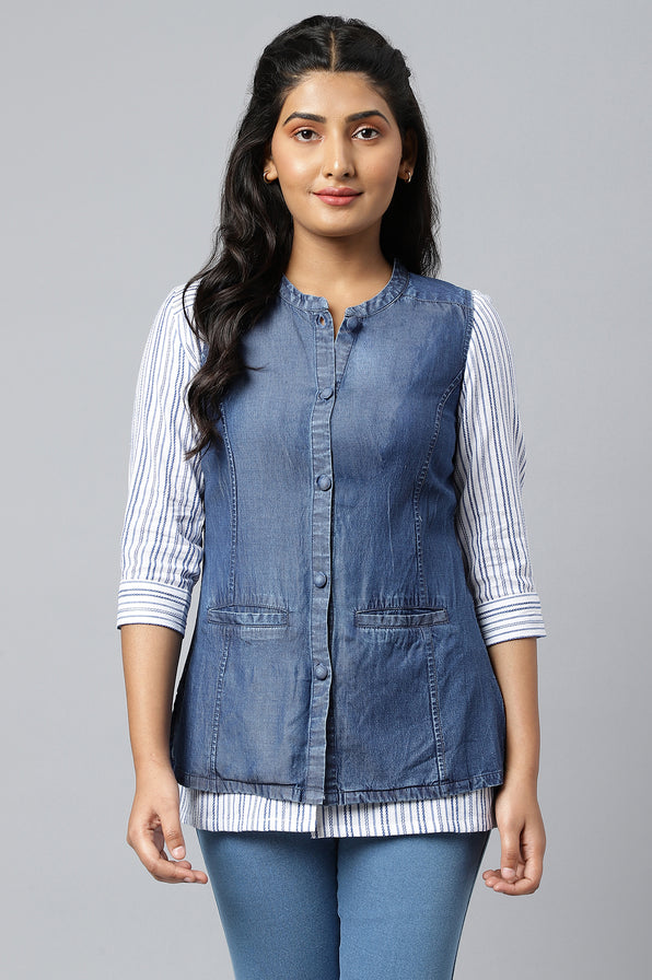 There's nothing quite like a versatile style that goes with everything. Layering will become more fun with this sleeveless denim jacket. It features two roomy pockets, princess line cut, and an interesting pleated back yoke detail.