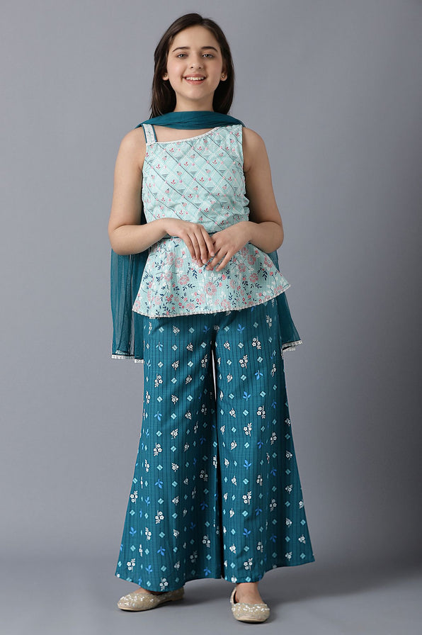 Girls Green Sleeveless Printed kurta With Palazzo And Dupatta