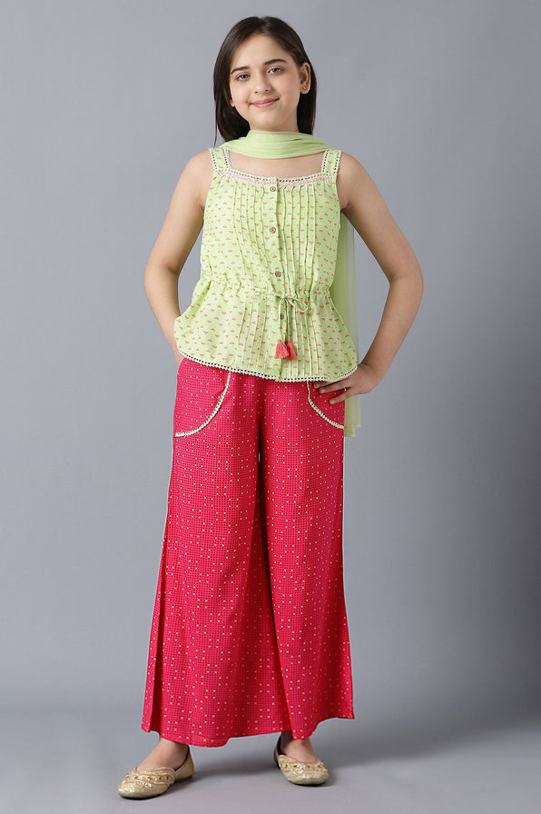 Doll Her Up In This Beautiful Light Green kurta Set. The Set Includes A Short Geometric Print kurta In Boat Neck With Front Button Closure And Flatters Pleats. It Is Paired With Pink Printed Palazzo Pants In Mid-Rise And Light Green Solid Dupatta.