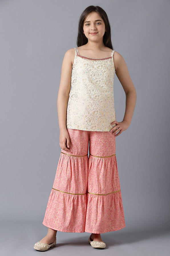 Deress Up Your Girl In This Sharara Set From Our Range For The Next Occasion In The Family. The Set Includes A Beautiful Light Pink Net Gillet. It Features Front Tie-Up And Foil Print All Over. The Gillet Comes With A Sleeveless Off-White Printed kurta Having Embellished Round Neckline And A Pair Of Pink Printed Sharara.