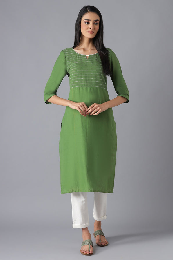 A straight-fit yarn-dyed kurta has round neck with V and three-quarter sleeves, it is paired with straight trousers in mid-rise and elasticated waistband. Effortlessly stylish yet elegant, this kurta set is a must-have for your summer wardrobe.