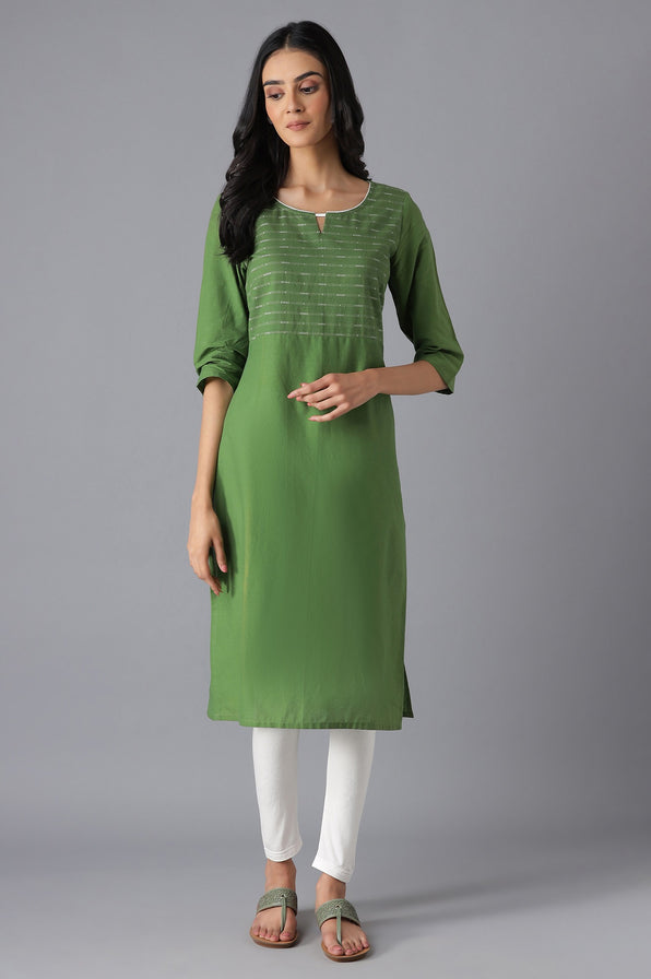 Green printed kurta in round neck with V has straight silhouette and three-quarter sleeves.