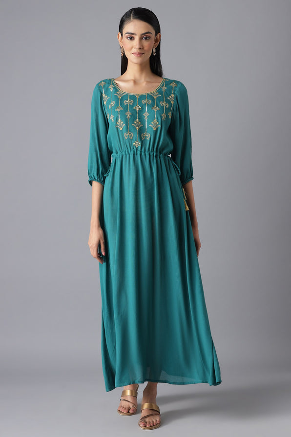 Slay your weekend brunches or dinner date in this beautiful flared floral print dress. The dress has round neck and three-quarter sleeves and comes with a dori and tassel tie-up.