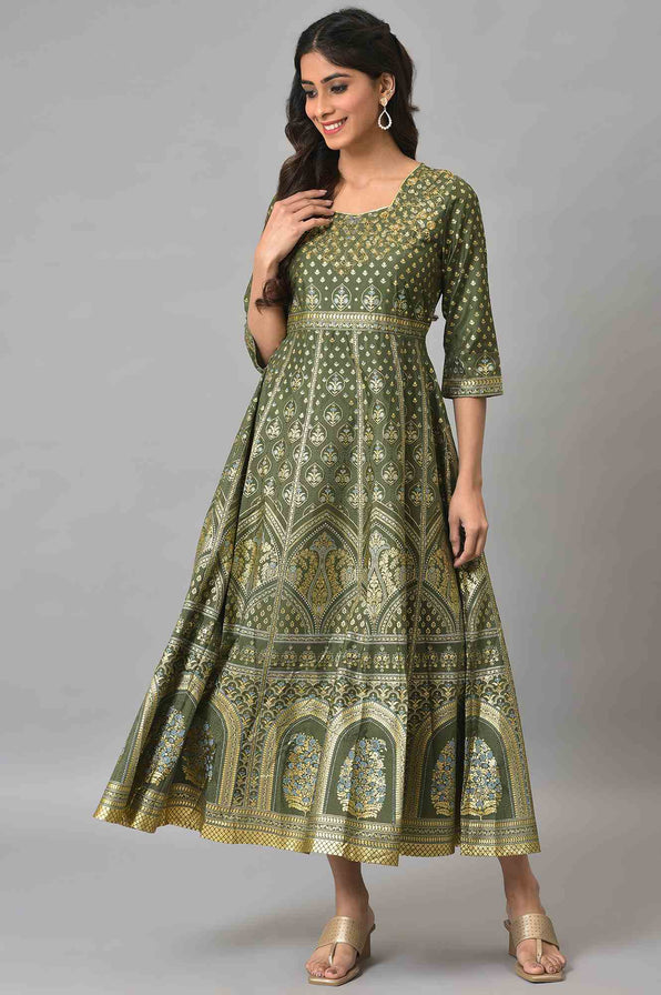 Effortless Yet Stylish, This Beautiful Floral Printed Flared Dress Is A Must-Have For Your Wardrobe. The Dress Comes In U-Neck And Three-Quarter Sleeves And Features Dori Embroidery And Zari Sequin Detailing.