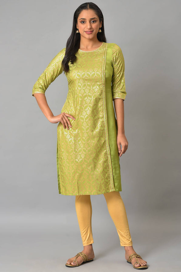 Keep It Simple Yet Trendy In This Stylised Mock Overlap Straight kurta. It Features A Pleated Layered Detail And Is Adorned With Gold Buttons And Lace Detal On The Mock Placket. It Is Also Highlighted With A Golden Lace On The Neck.