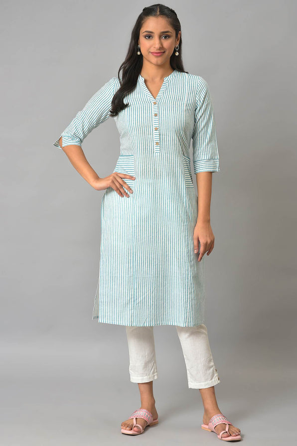 Look Eminently Stylish In This Straight, Aquarelle Striped Two Way Slub kurta With Pockets, Mandarin Collar And Wooden Button Details On The Mock Placket.