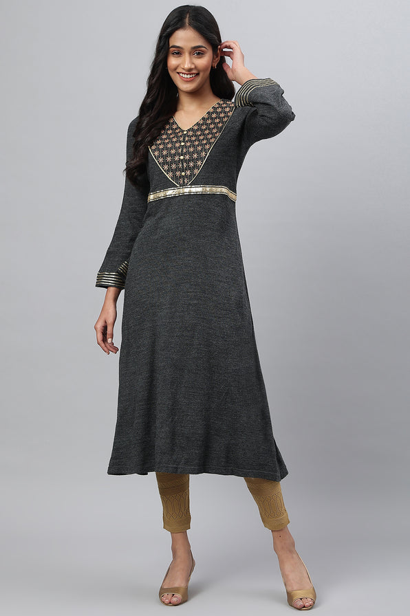 Get Going, Get Flowing In This Stunning Dress. Curated In Astounding Melange Acrylic, This Garment In Balanced With Floral Embroidery, Fixed Embellished Belt At Waist And Dori Tie Detail To Cinch The Waist.