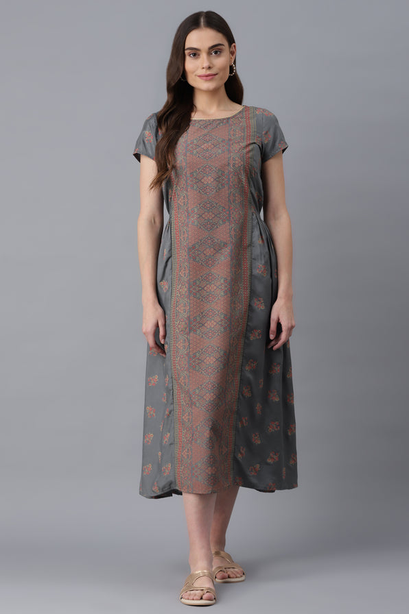 Doll up and swirl in fashion with this stunning grey flared dress in gathered body details and ankle length. The dress crafted in american crepe and has floral print and gold mandarin collar with button closure.