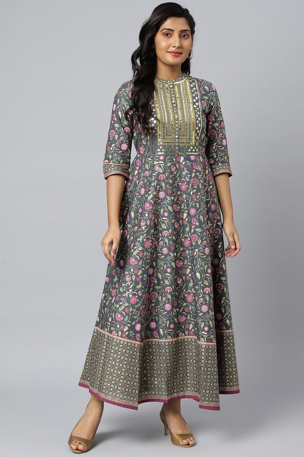 Swirl in style in this flared ethnic dress by Aurelia. Crafted in premium fabric, the dress has ankle length and rounded hem. It comes in geometric print and sequin highlights.