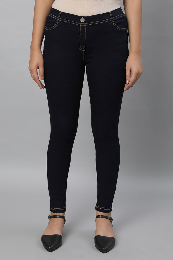 Crafted for effortless style and comfort, these Navy Blue Solid Skinny-fit Denim Jeggings are a wardrobe essential. Designed with a slip-on closure and two functional front and back pockets, they offer a sleek silhouette that flatters your figure. The woven fabric blend of cotton, polyester, and lycra ensures durability and stretch for all-day wear. Perfect for casual outings, pair these jeggings with a chic top or kurta to complete your look.