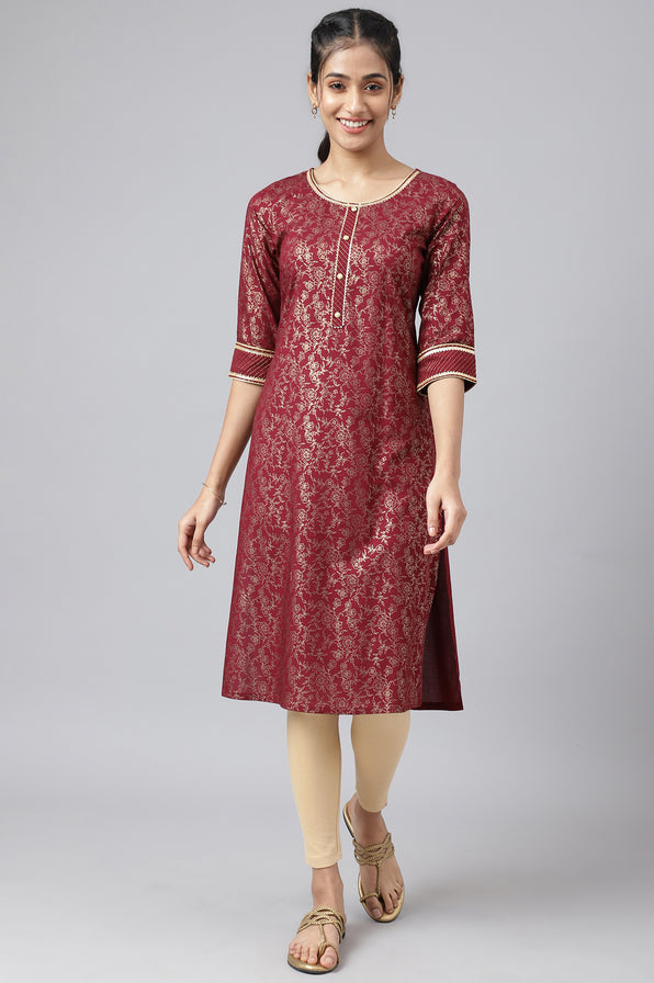 Curated in soft rayon, with dark rich base and gold foil printed all over jaal, this garment is balanced with works of zari stitch lines on placket and cuff. To add more definition to this piece, it is highlighted with gold lace work.