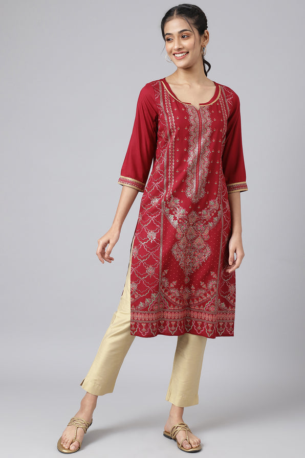 Elegantant and classic, this straight kurta is a flattering choice for any light festive occasion that you've been invited to. It is enriched with a golden lace at the neck and a beautifully enhanced placement print. Pair it with our fashion bottoms to give it an elaborated look or you could also pair it with solid tights to keep it simple.