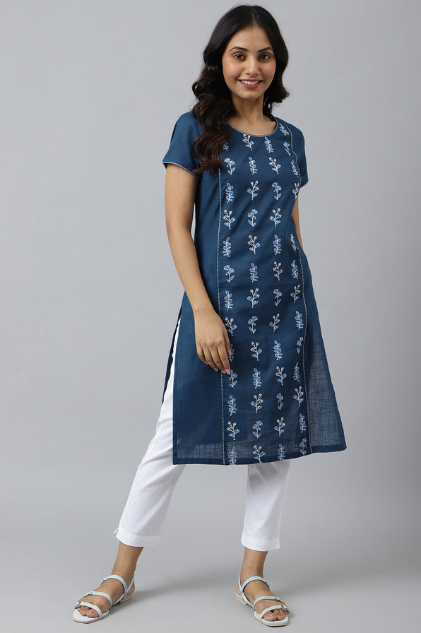 Feminine and chic, this straight kurta in diaphanous cotton-slub fabric is highlighted with delicate dori and satin stitch embroidery in the centre panel. Lace details at neck, sleeves and centre panel make it ideal for casual or formal evening out with friends and family. Mix and match it with our printed fashion palazzo for a chic casual look.