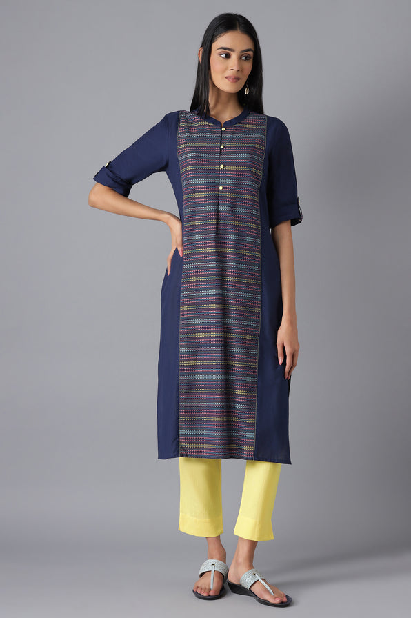 Get the stunning casual look in this pretty navy printed kurta. Crafted in cotton, it has straight silhouette and gives wearer a comfy yet stylish look.