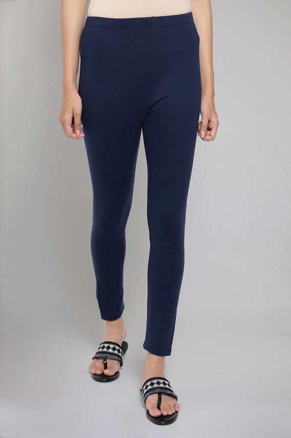 Stay comfortable and look stylish in these winter tights. Navy interlock solid tights in ankle length and mid-rise.