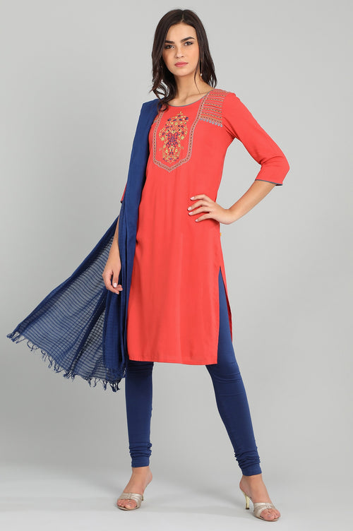 Orange round neck 3/4 sleeve kurta with printed detail.