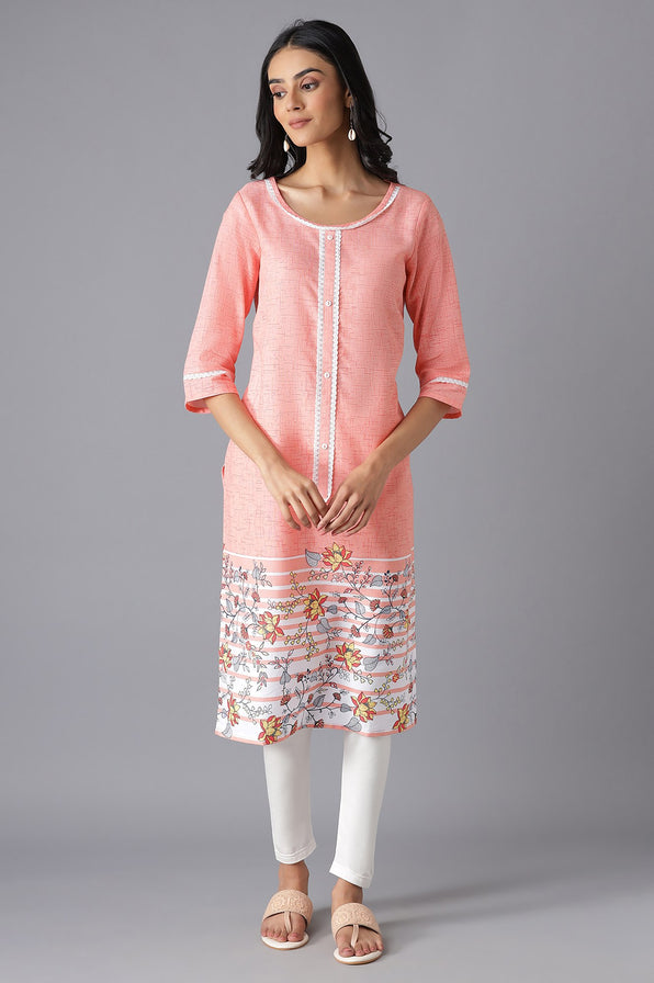Embrace ethnicity in style by wearing peach coloured kurta. This modern ethnic kurta will uplift your casual look, whether you're on a date or in office it's straight fit will give an elegant yet stylish look.