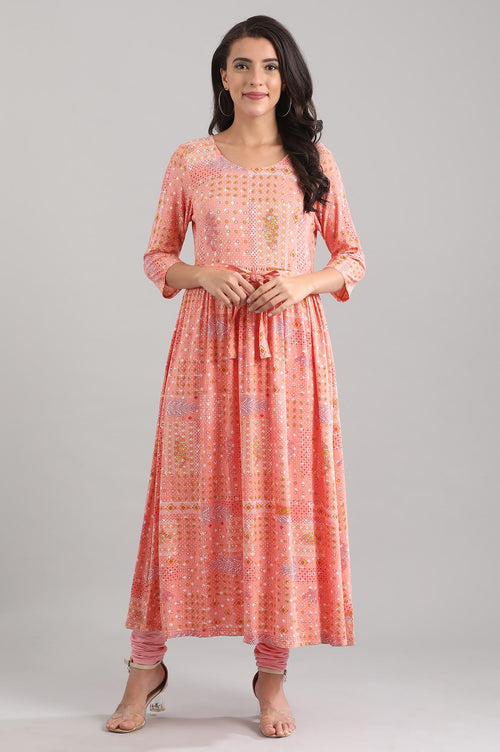 Peach round neck A-line Liva dress with floral print detail and tie-up belt at the waist.