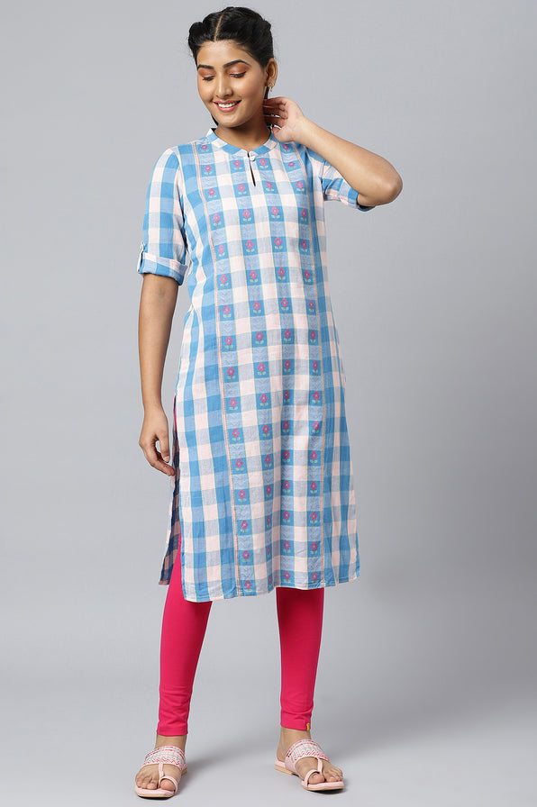 This straight fit kurta falls below the knees and comes with slits along the sides to help you move with ease. Crafted in opulent color blocked checks, this kurta features geometric floral dobby motifs for an added elegance.