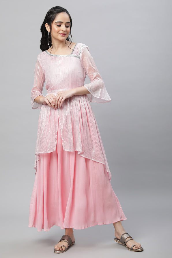 Shower a fashionable edge to your contemporary wedding wear collection in this double layered dress. Crafted in a delicate chiffon fabric, it features an attached peplum layer. It has an asymmetrical neckline and is highlighted with gold sequin tape.