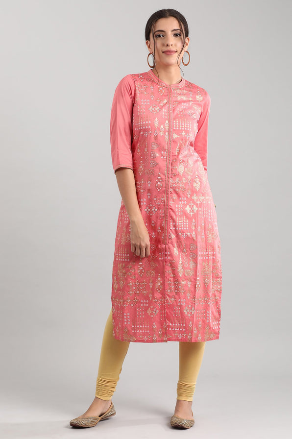 Pink band collar straight kurta with ornamental print detail and mock placket on the front.