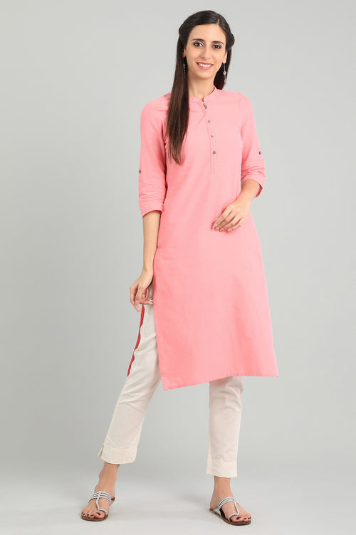 Pink band collar 3/4 sleeve kurta with button placket on the front.