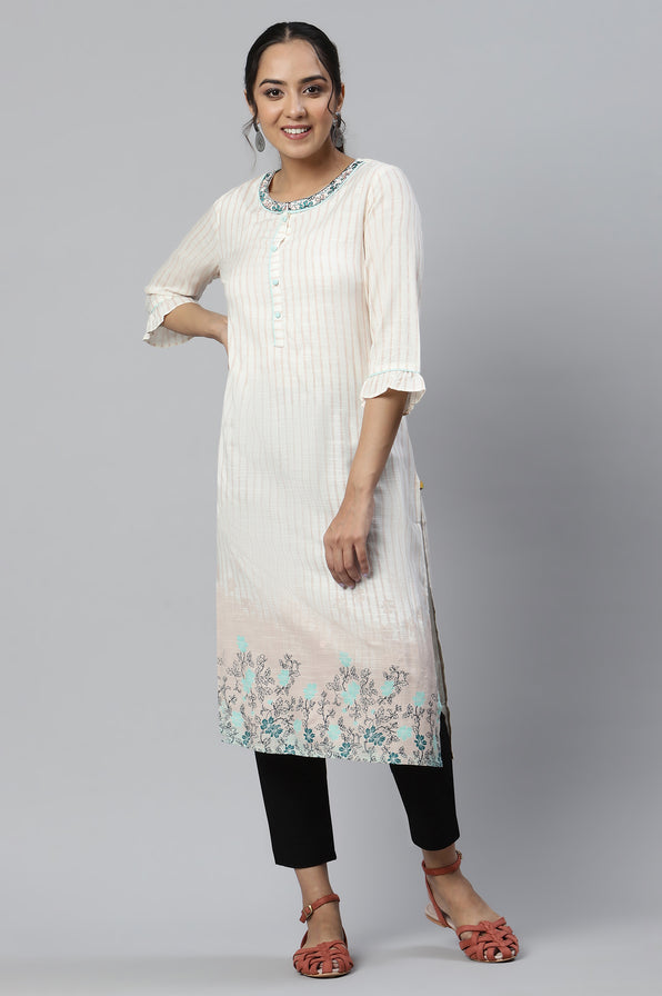 Pop up your wardrobe with this vibrant stripped kurta, adorned with a colourful embroidered collar and complimenting print of floral ombre.