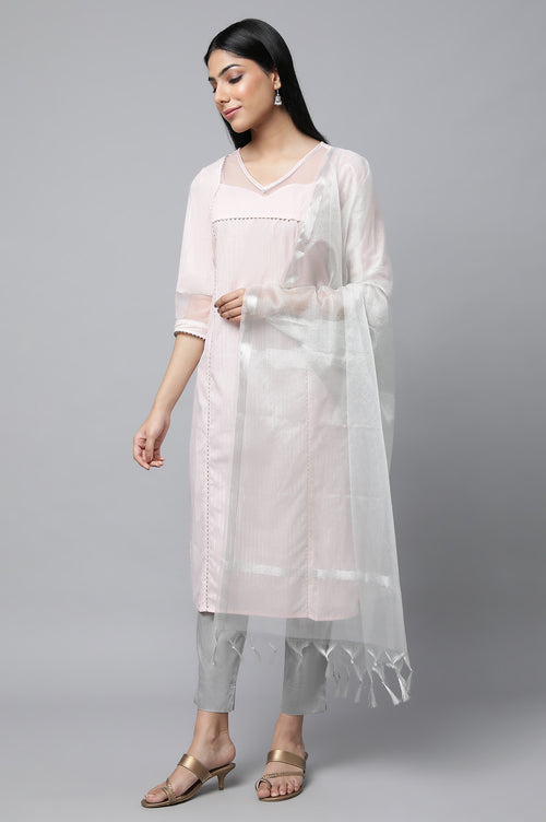 Get the stunning and pretty festive look in this stylish W kurta set. The set has pink sequined straight kurta with lurex lines on it. It is paired with grey trouser pants and dupatta.