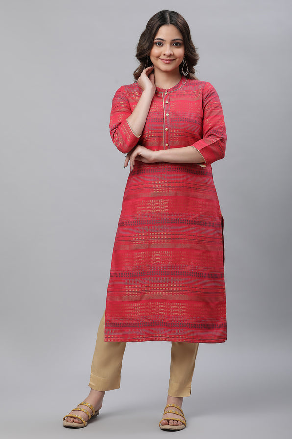 A classic straight fit kurta in a red & gold dobby fabric. It has band with placket and contrasting piping.