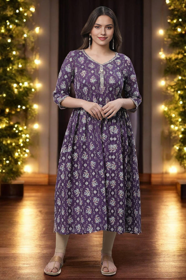 Purple Floral Printed Flared Kurta
