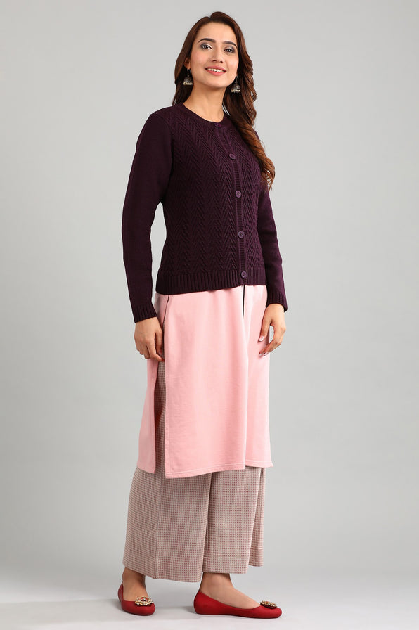 Purple round neck solid sweater with button placket detail.