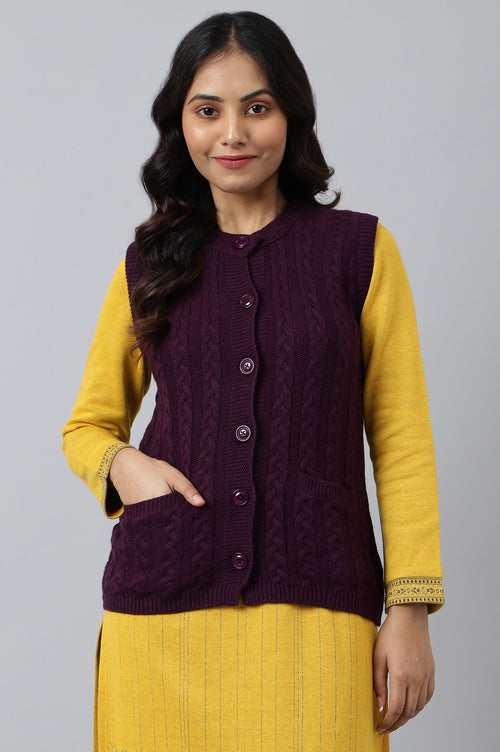A sleeveless short length sweater with a cable design, ribbed placket and tonal button detail is an absolute must have for the chilly winters. It'll keep you warm and cozy and will definitely add a fashionable touch to your look.