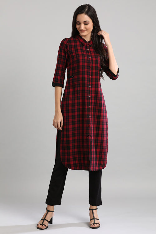 This red collar neck 3/4 sleeve yarn-dyed kurta has roll-up sleeves, full button placket and curved hem.