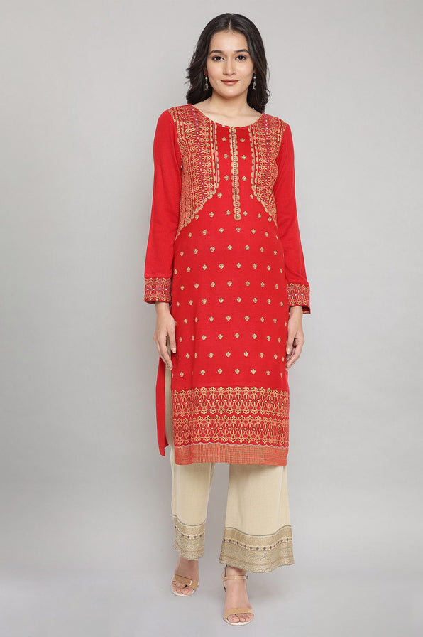 Lit up your winter celebrations with this ethnic winter kurta in red colour, adorned with sequin work and geometric print.