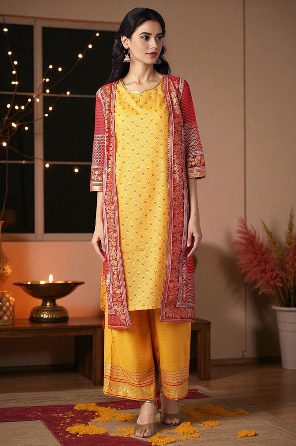 For an elevated and modern ethnic look, you can pick this Gillet and kurta set from Aurelia. The set includes straight printed Gillet and sleeveless semi-sheer yellow kurta. And the top wear set paired with straight palazzo pants.