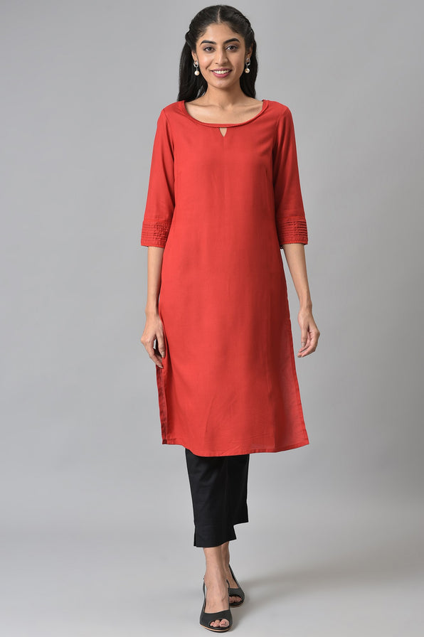 A classic basic kurta curated in 30s Rayon fabric and enhanced with a tonal dyed lace on the neck and sleeves. The piece features pin tucks on the sleeves and v- keyhole on the neck as the key design element. Also available in multiple colors.