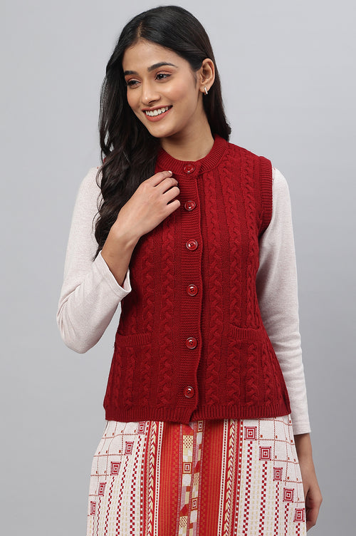A sleeveless short length sweater with a cable design, ribbed placket and tonal button detail is an absolute must have for the chilly winters. It'll keep you warm and cozy and will definitely add a fashionable touch to your look.