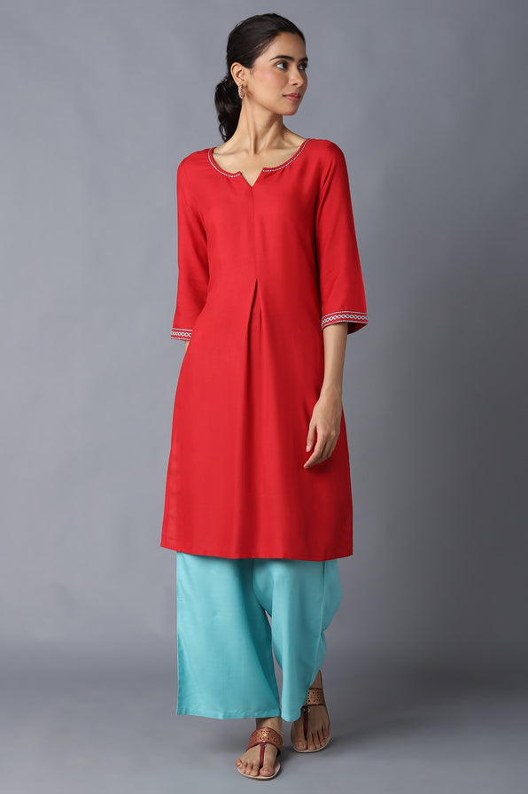 Step Out In Confidence With This Stunning And Statement-Making Modern Ethnic Suit Set. The Set Includes Red Solid Round Neck kurta In Staright Silhouette, It Features Thready Embroidery. kurta Is Coordinated With Light Teal Straight Palazzo Pants.