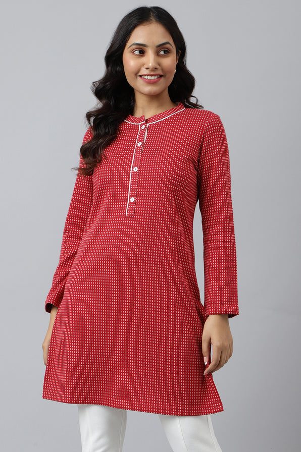 Running out of classics? Dont worry, we've got you covered. A short kurta that features a mandarin collar and placket detail with contrasting buttons on it. Pair it with our classic white yoga tights that has two roomy pockets that can keep your essentials.