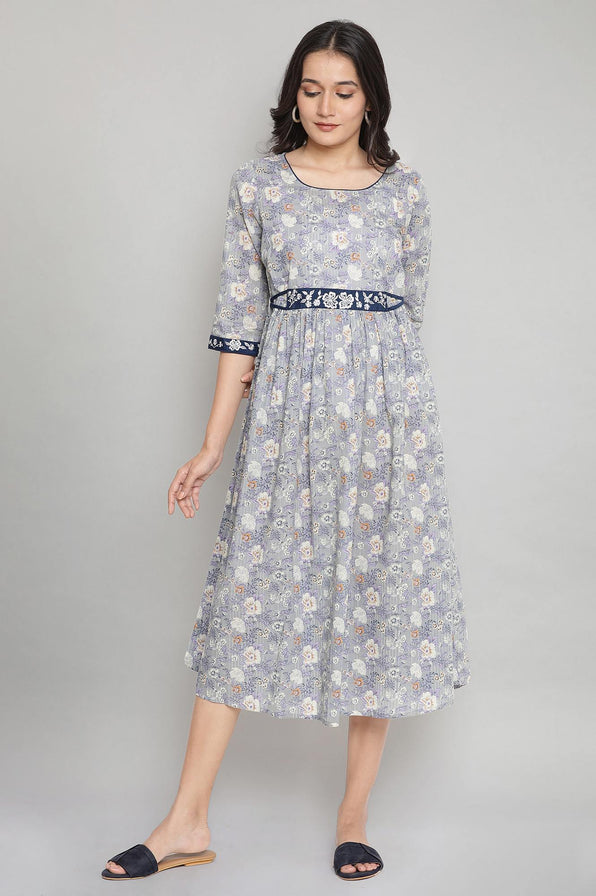 An airy cotton dress in floral print having round neck and thread embroidery on waist belt in blue colour.