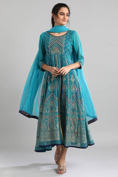This set has a teal blue round neck 3/4 sleeve ankle-length dress with printed, embroidery and beaded detail, comes with a blue dupatta with border detail.