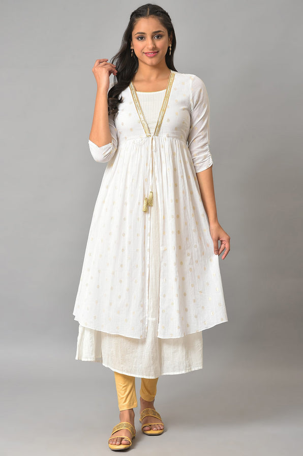 Amp Up Your Wardrobe As You Step Into This Amazingly Elegant And Delicate Double Layered Jacquard kurta. It Showcases An Elasticised Waist For The Ease And A Crinkeled Inner To Give Volume. Pair This Beauty With Aurelia Core Gold Poly Lycra Tights And Cationic Viscose Dupatta For A Complete Look.
