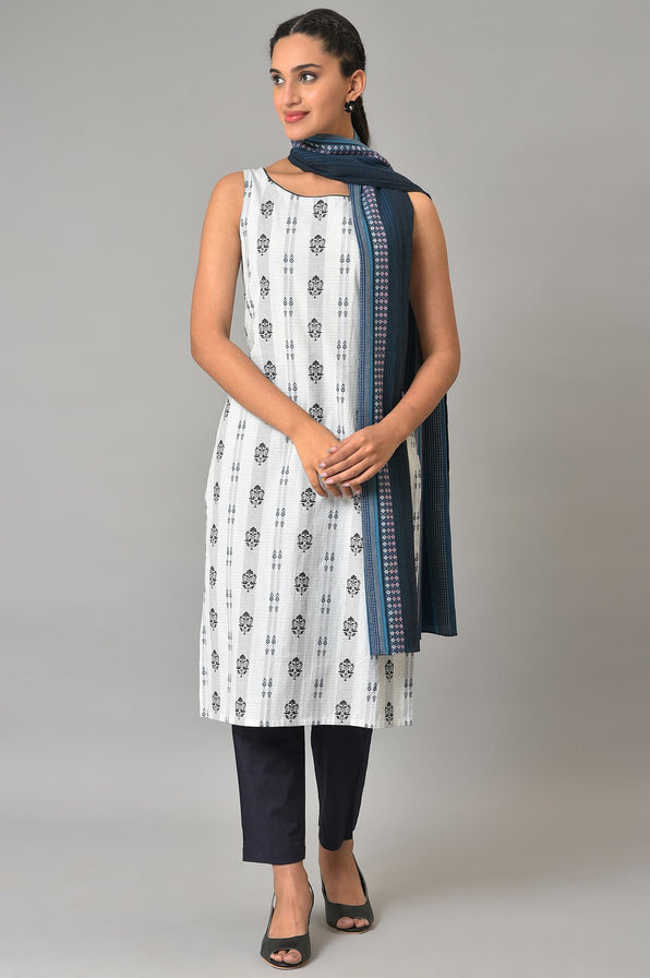 Escape The Mundane In This Three Piece kurta Set That Incorporates A Sleeveless Dobby kurta, Paired With A Contrasting Bottom And A Contrasting Drape. Fabricated In The Finest Yarns, It Offers An Easy And A Comfortable Look.