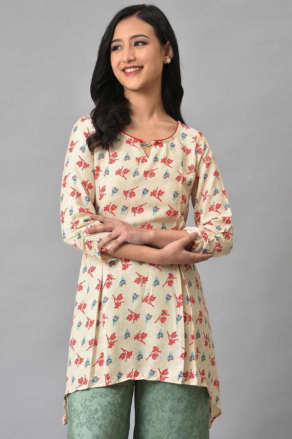Look Classy And Beautiful At Your Family Lunch Party In This Asymmetric kurta By Aurelia. The kurta Has Round Neckline With V And It Is Accentuated With Floral Foil Print.